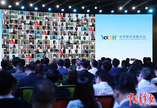 7月21日,北京,世界青年發(fā)展論壇開幕式上,大屏幕上顯示著世界各地青年代表通過視頻參會的畫面。中青報·中青網(wǎng)記者 陳劍/攝