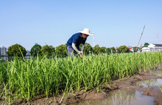 記者循著周雷同事手指的方向看過去,一個頭戴草帽、腳穿膠鞋、皮膚黝黑的“莊稼漢”正弓著腰在稻田里忙碌,他身上的衣服早已被汗水浸透。