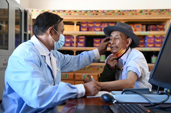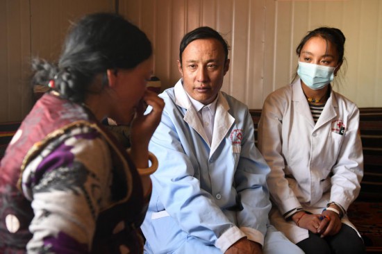 布久索南更青(左)為患者診療(8月11日攝)。新華社記者 范培珅 攝