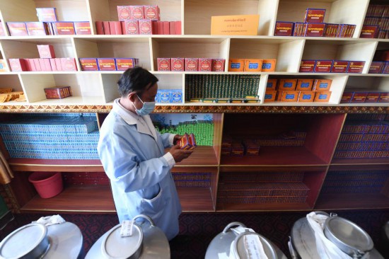 布久索南更青在治多縣索加鄉(xiāng)衛(wèi)生院查看藥品(8月11日攝)。新華社記者 范培珅 攝