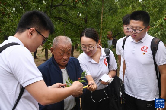 中國海洋大學紅旗智援博士團成員在山東省樂陵市朱集鎮(zhèn)大常村棗林向果農(nóng)了解果樹種植情況(2019年9月19日攝)。新華社記者 李紫恒 攝