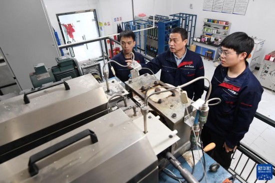 福建閩江學院服裝與藝術(shù)工程學院教授李永貴(中)在“福建省新型功能性紡織纖維及材料重點實驗室”教學生做紡絲實驗(2021年3月22日攝)。新華社記者 林善傳 攝