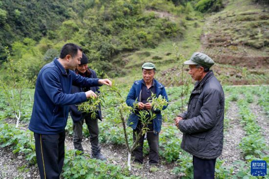 在重慶市巫溪縣天元鄉(xiāng)萬春村,專家團隊成員王大平(左一)對村民進行冬桃樹苗整形壓枝培訓(2020年4月23日攝)。新華社記者 黃偉 攝