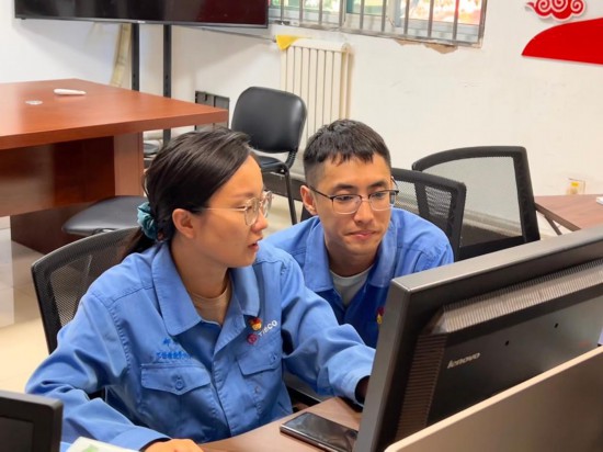 段浩杰(右)在與同事討論工作。新華社記者張磊攝
