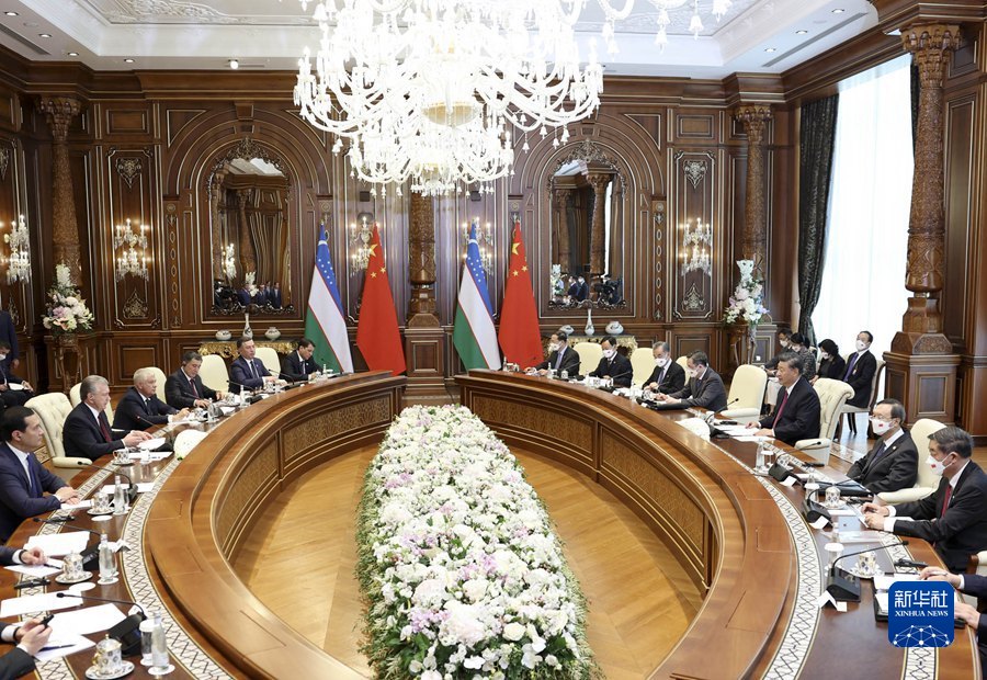 當(dāng)?shù)貢r(shí)間9月15日,國(guó)家主席習(xí)近平在撒馬爾罕同烏茲別克斯坦總統(tǒng)米爾濟(jì)約耶夫會(huì)談。新華社記者 丁海濤 攝