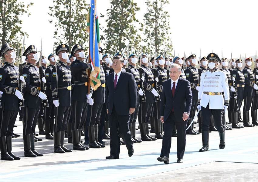 當?shù)貢r間9月15日,國家主席習近平在撒馬爾罕同烏茲別克斯坦總統(tǒng)米爾濟約耶夫會談。會談前,米爾濟約耶夫為習近平舉行隆重歡迎儀式。新華社記者 申宏 攝