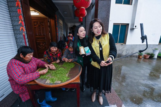 3月22日,直播達(dá)人在諸暨市趙家鎮(zhèn)東莊村上陽自然村直播高山有機(jī)茶制作情況。新華社記者徐昱 攝