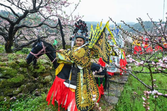 3月25日,杭州富陽區(qū)新登鎮(zhèn)半山村桃園內(nèi)有傳統(tǒng)竹馬表演。新華社記者徐昱 攝