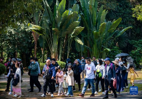 游客在位于云南省西雙版納州勐臘縣勐侖鎮(zhèn)的中國(guó)科學(xué)院西雙版納熱帶植物園內(nèi)游覽(2023年2月12日攝)。新華社記者 陳欣波 攝
