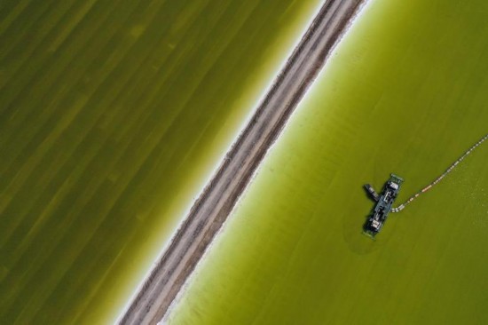2022年4月1日,采鹽船在青海鹽湖工業(yè)股份有限公司鉀肥分公司的鹽湖工作。新華社記者張龍 攝