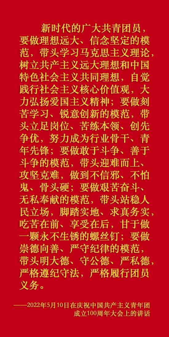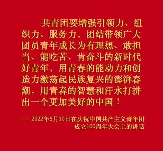 在慶祝中國共產(chǎn)主義青年團成立100周年大會上,習(xí)近平總書記從黨和國家事業(yè)發(fā)展全局出發(fā),給共青團明確提出了4點希望,飽含深情、催人奮進。