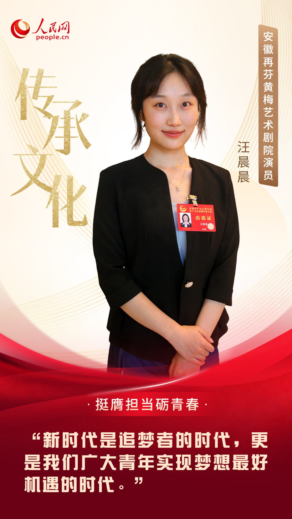 汪晨晨,2001年出生,共青團(tuán)十九大代表,現(xiàn)為安徽再芬黃梅藝術(shù)劇院演員。
