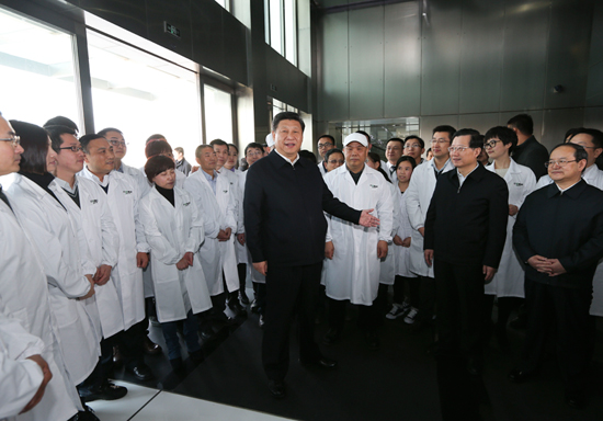 2016年2月3日,習近平在江中集團江中藥谷制造基地考察時同企業(yè)科技人員在一起。新華社記者 蘭紅光攝