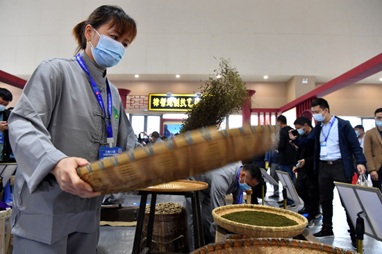 在樟樹岐黃小鎮(zhèn)里,藥工正在進行樟幫中藥炮制技藝展演。 人民網(wǎng)記者 時雨攝