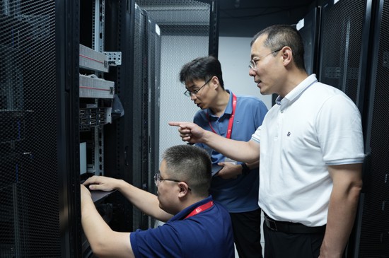 麒麟軟件有限公司機房內(nèi),孔金珠(右一)和同事在一起工作。 麒麟軟件有限公司供圖