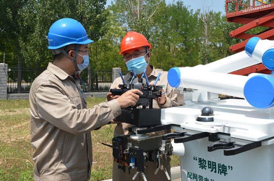 在國網(wǎng)南瑞天津基地,張黎明(右一)和研發(fā)人員一起調(diào)試配網(wǎng)帶電機器人。 國網(wǎng)天津濱海供電公司供圖