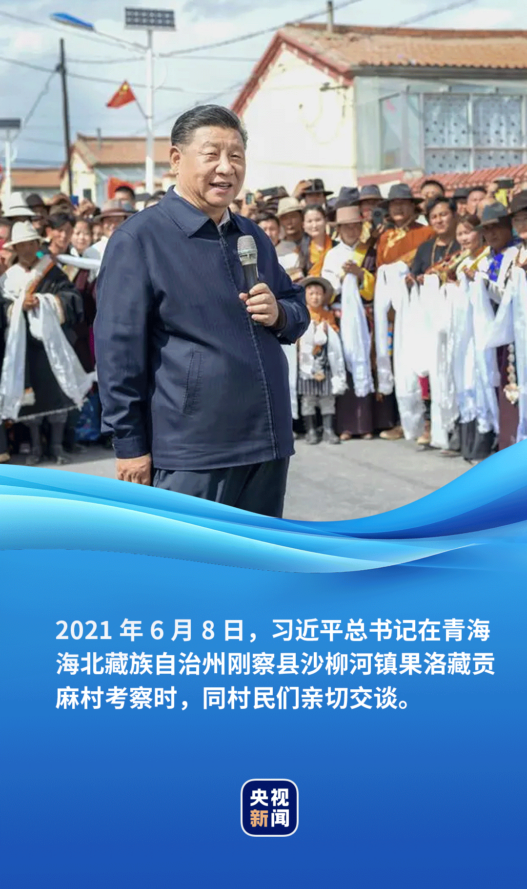 藍(lán)天白云下,一排排紅瓦黃墻的平房小院錯(cuò)落有致,筆直整潔的村道兩旁立著太陽(yáng)能路燈。村民索南才讓帶著一家三代站在家門(mén)口,向總書(shū)記獻(xiàn)上潔白的哈達(dá)。