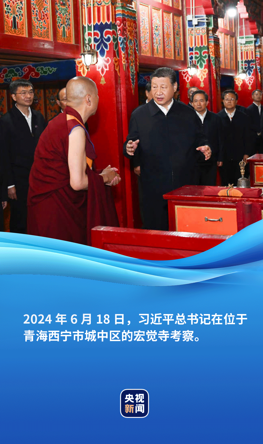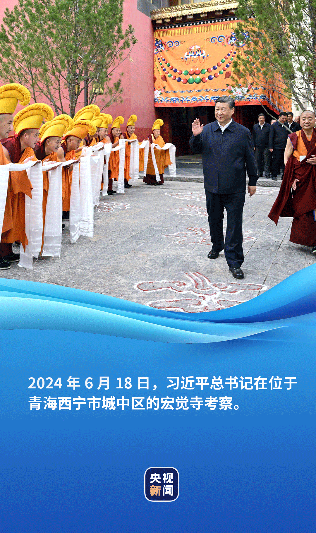 6月18日,正在青海考察的習(xí)近平總書(shū)記來(lái)到位于西寧市城中區(qū)的宏覺(jué)寺。在寺前院落,宏覺(jué)寺民主管理委員會(huì)負(fù)責(zé)人向總書(shū)記敬獻(xiàn)哈達(dá),僧人提香爐、持寶傘迎接總書(shū)記。