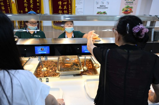 老人正在杭州翠苑一區(qū)老年食堂挑選餐品(7月25日攝)。新華社記者 李賀 攝