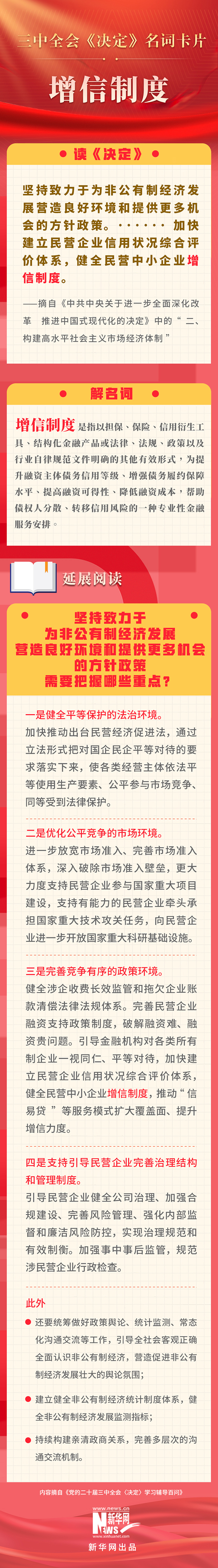 黨的二十屆三中全會審議通過了《中共中央關于進一步全面深化改革、推進中國式現代化的決定》。新華網依據《黨的二十屆三中全會〈決定〉學習輔導百問》,制作三中全會《決定》系列名詞卡片,和大家一起來深入學習領會二十屆三中全會精神。本期名詞是“增信制度”。