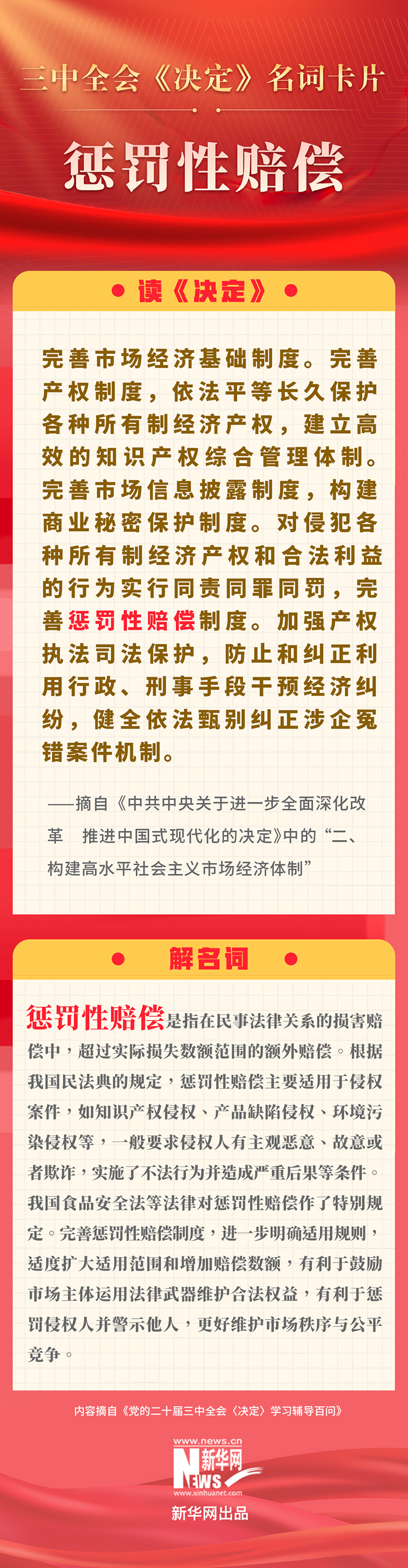 黨的二十屆三中全會審議通過了《中共中央關(guān)于進一步全面深化改革、推進中國式現(xiàn)代化的決定》。新華網(wǎng)依據(jù)《黨的二十屆三中全會〈決定〉學習輔導百問》,制作三中全會《決定》系列名詞卡片,和大家一起來深入學習領(lǐng)會二十屆三中全會精神。本期名詞是“懲罰性賠償”。
