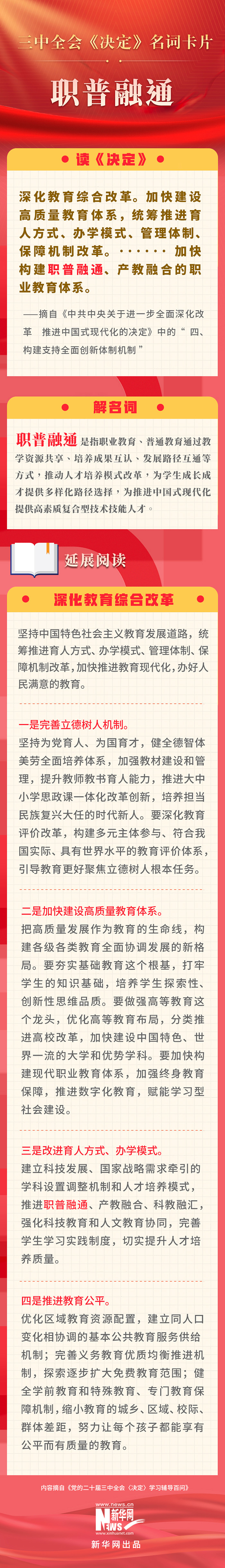 黨的二十屆三中全會(huì)審議通過(guò)了《中共中央關(guān)于進(jìn)一步全面深化改革、推進(jìn)中國(guó)式現(xiàn)代化的決定》。新華網(wǎng)依據(jù)《黨的二十屆三中全會(huì)〈決定〉學(xué)習(xí)輔導(dǎo)百問(wèn)》,制作三中全會(huì)《決定》系列名詞卡片,和大家一起來(lái)深入學(xué)習(xí)領(lǐng)會(huì)二十屆三中全會(huì)精神。本期名詞是“職普融通”。