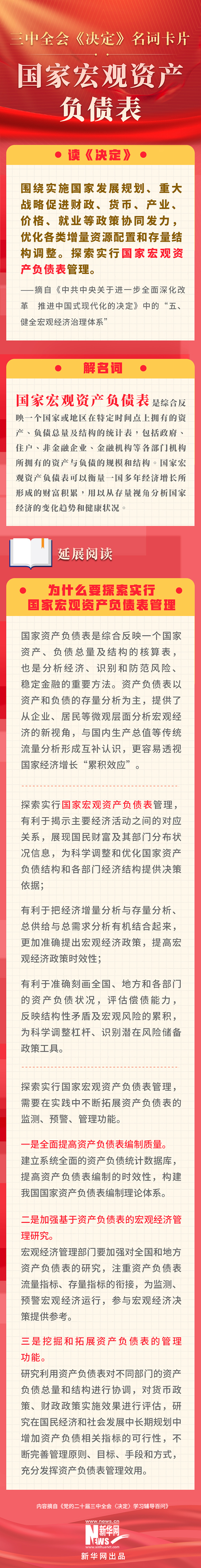 黨的二十屆三中全會審議通過了《中共中央關(guān)于進(jìn)一步全面深化改革、推進(jìn)中國式現(xiàn)代化的決定》。新華網(wǎng)依據(jù)《黨的二十屆三中全會〈決定〉學(xué)習(xí)輔導(dǎo)百問》,制作三中全會《決定》系列名詞卡片,和大家一起來深入學(xué)習(xí)領(lǐng)會二十屆三中全會精神。本期名詞是“國家宏觀資產(chǎn)負(fù)債表”。