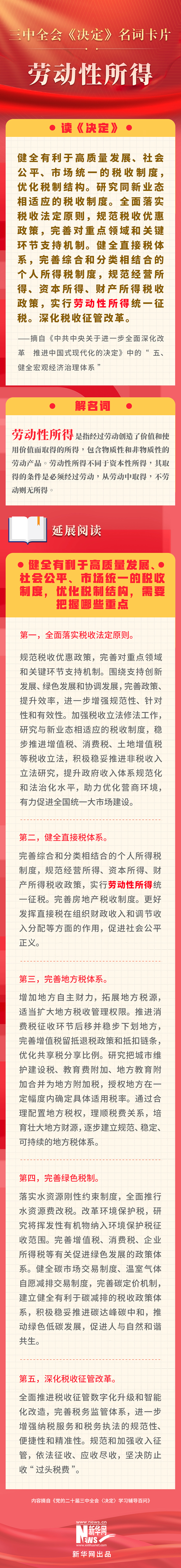 黨的二十屆三中全會審議通過了《中共中央關于進一步全面深化改革、推進中國式現(xiàn)代化的決定》。新華網(wǎng)依據(jù)《黨的二十屆三中全會〈決定〉學習輔導百問》,制作三中全會《決定》系列名詞卡片,和大家一起來深入學習領會二十屆三中全會精神。本期名詞是“勞動性所得”。
