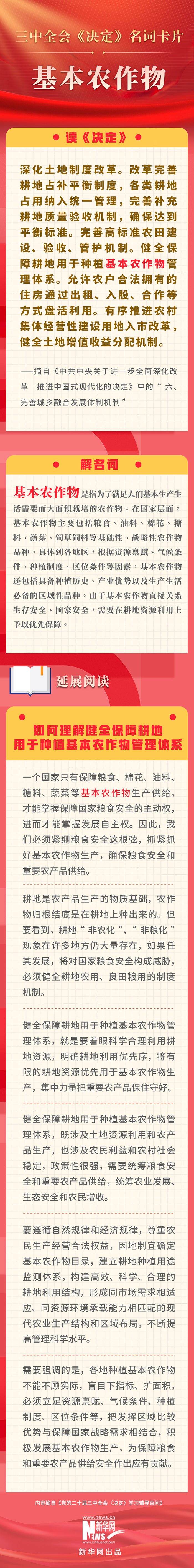黨的二十屆三中全會(huì)審議通過(guò)了《中共中央關(guān)于進(jìn)一步全面深化改革、推進(jìn)中國(guó)式現(xiàn)代化的決定》。新華網(wǎng)依據(jù)《黨的二十屆三中全會(huì)〈決定〉學(xué)習(xí)輔導(dǎo)百問(wèn)》,制作三中全會(huì)《決定》系列名詞卡片,和大家一起來(lái)深入學(xué)習(xí)領(lǐng)會(huì)二十屆三中全會(huì)精神。本期名詞是“基本農(nóng)作物”。