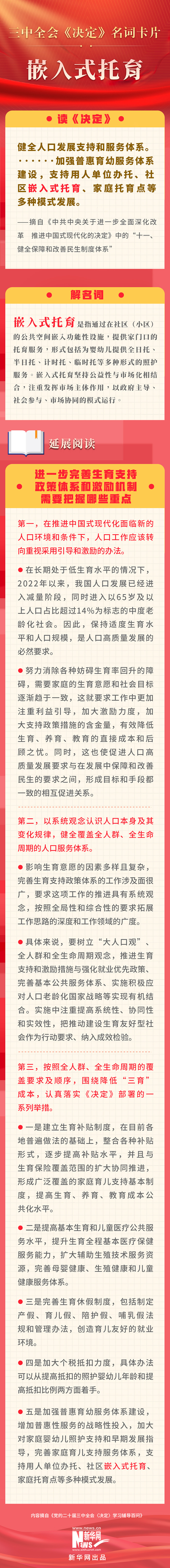 黨的二十屆三中全會審議通過了《中共中央關于進一步全面深化改革、推進中國式現(xiàn)代化的決定》。新華網(wǎng)依據(jù)《黨的二十屆三中全會〈決定〉學習輔導百問》,制作三中全會《決定》系列名詞卡片,和大家一起來深入學習領會二十屆三中全會精神。本期名詞是“嵌入式托育”。