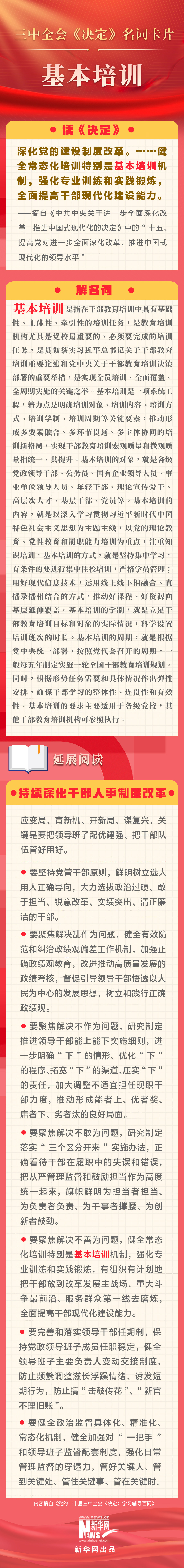 黨的二十屆三中全會審議通過了《中共中央關(guān)于進一步全面深化改革、推進中國式現(xiàn)代化的決定》。新華網(wǎng)依據(jù)《黨的二十屆三中全會〈決定〉學習輔導百問》,制作三中全會《決定》系列名詞卡片,和大家一起來深入學習領(lǐng)會二十屆三中全會精神。本期名詞是“基本培訓”。