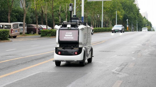 圖為正在執(zhí)勤中的警用無人巡邏車。新華社記者胡銳 攝