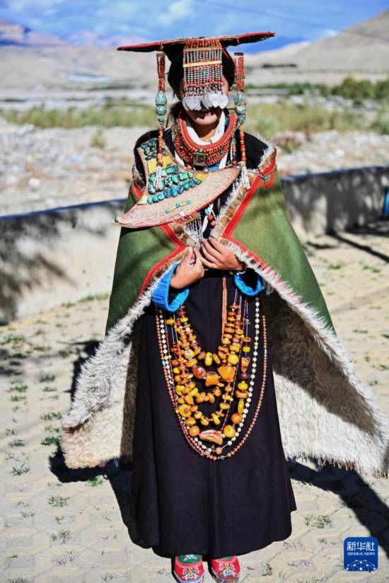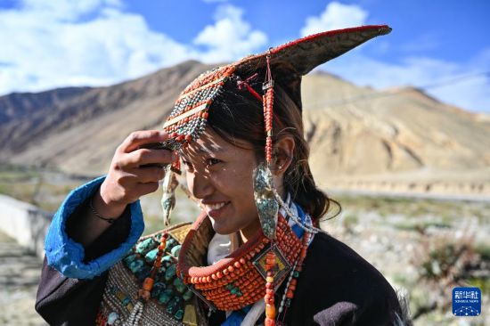 9月9日,在西藏阿里地區(qū)普蘭縣科迦村,村民展示普蘭服飾。