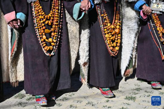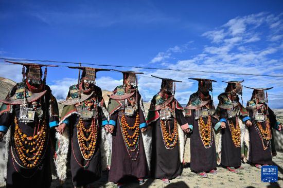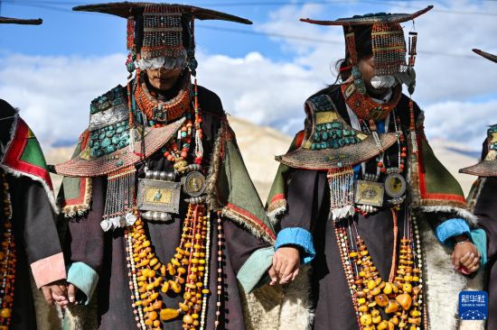9月9日,在西藏阿里地區(qū)普蘭縣科迦村,村民身著普蘭服飾表演宣舞。