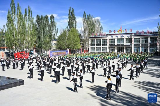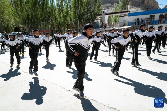 在西藏阿里地區(qū)札達縣九年一貫制學校,孩子們跳起融入國家級非物質(zhì)文化遺產(chǎn)“宣舞”特色的課間操(9月10日攝)。新華社記者 孫瑞博 攝