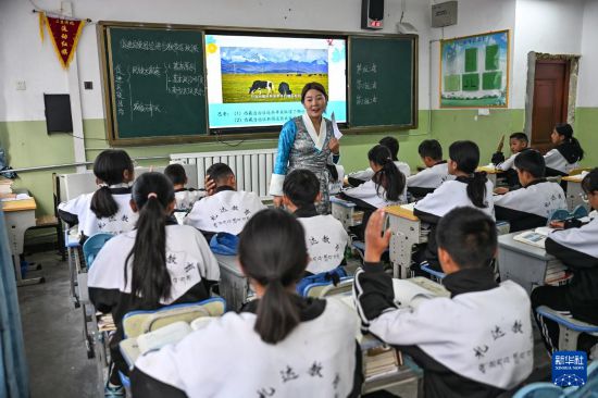 在西藏阿里地區(qū)札達縣九年一貫制學校,老師次仁曲加給初三(2)班的學生上課(9月10日攝)。新華社記者 孫瑞博 攝