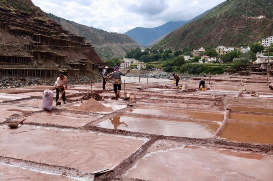 當(dāng)?shù)卮迕袢员3种嫉氖止覃}方式,他們從瀾滄江畔的鹽井、鹽池中取出鹵水倒入鹽田,經(jīng)陽(yáng)光蒸曬、風(fēng)干,結(jié)晶成鹽。遠(yuǎn)遠(yuǎn)望去,鹽田錯(cuò)落有致,景色奇美。