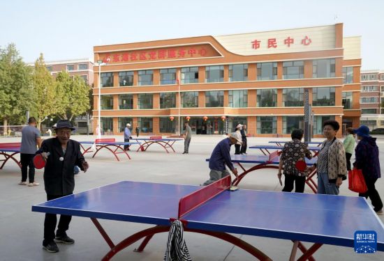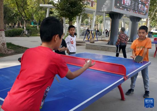 9月22日,在新疆喀什市東湖社區(qū),社區(qū)居民在社區(qū)廣場(chǎng)打乒乓球。新華社記者 趙宇思 攝