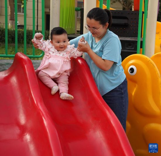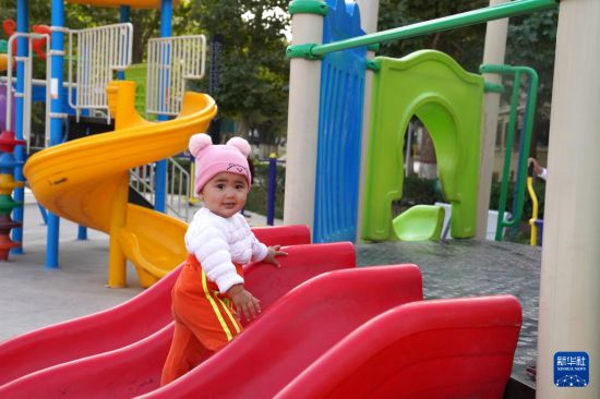 9月22日,在新疆喀什市東湖社區(qū),孩子在社區(qū)廣場(chǎng)的兒童游樂(lè)場(chǎng)玩耍。新華社記者 趙宇思 攝