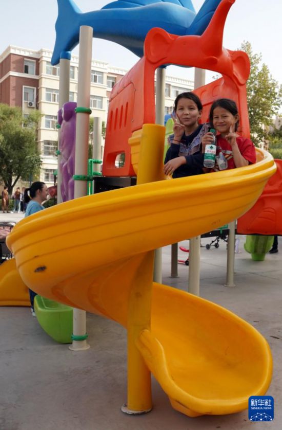 9月22日,在新疆喀什市東湖社區(qū),兩名兒童在社區(qū)廣場(chǎng)的兒童游樂(lè)場(chǎng)玩耍。新華社記者 趙宇思 攝