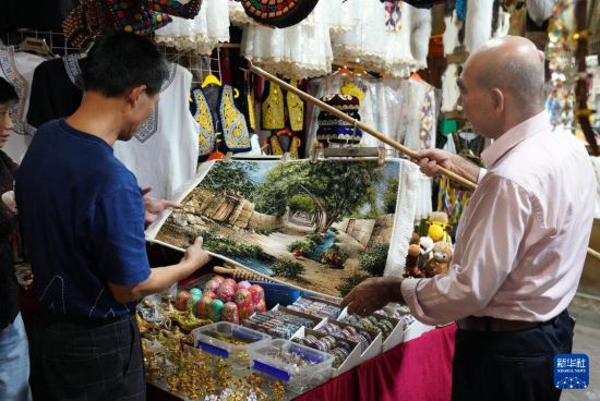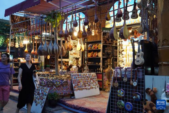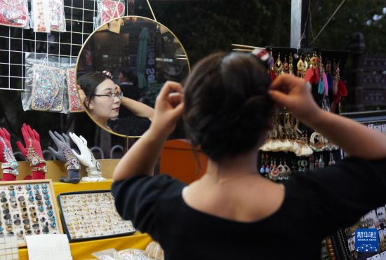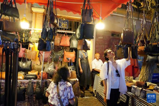 9月19日晚,在新疆喀什古城景區(qū),游客在選購皮包。新華社記者 趙宇思 攝