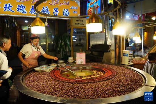 9月19日晚,在新疆喀什古城景區(qū),一名游客購買特色小吃“玫瑰花鴿子湯”。新華社記者 趙宇思 攝