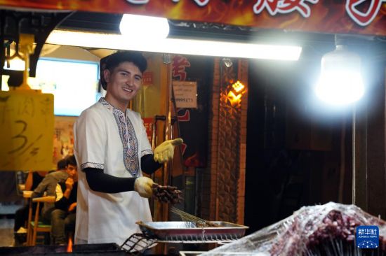 9月19日晚,在新疆喀什古城景區(qū),一名維吾爾族小伙在售賣羊肉串。新華社記者 趙宇思 攝