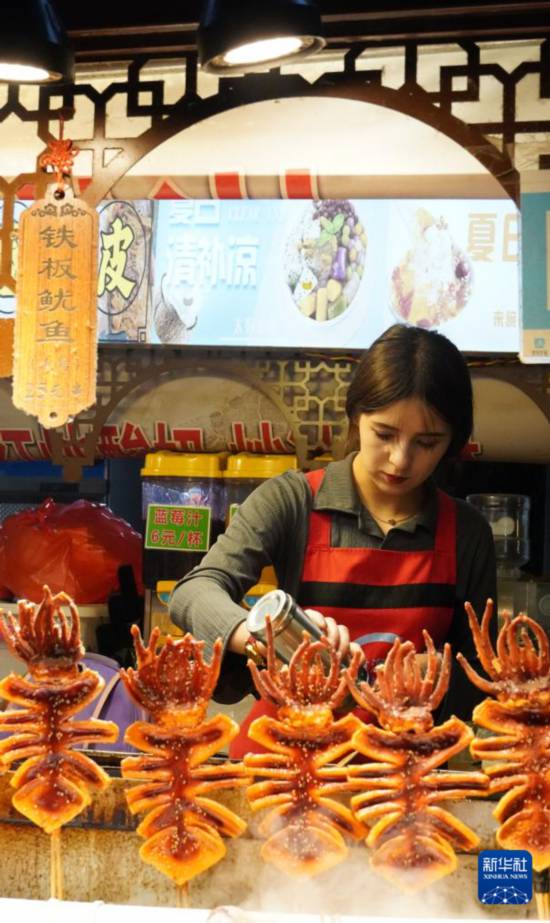 9月19日晚,在新疆喀什古城景區(qū),一名維吾爾族姑娘在制作小吃。新華社記者 趙宇思 攝