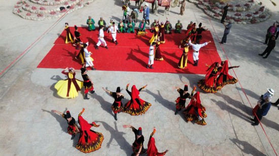 9月25日,演員在位于阿瓦提縣的刀郎部落景區(qū)表演歌舞(無人機照片)。新華社記者 阮帥 攝