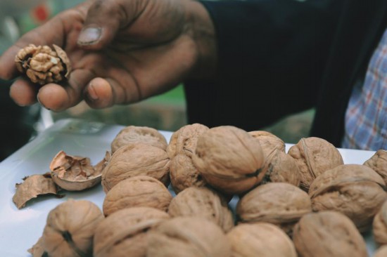 9月24日,溫宿縣核桃林里,果農掰開核桃。新華社記者 任沁沁 攝