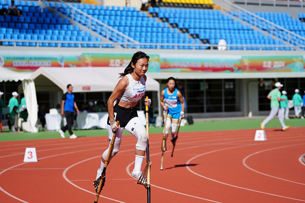 當(dāng)日運(yùn)動(dòng)會(huì)的高腳競(jìng)速項(xiàng)目分為男子100米、200米、400米以及女子100米、200米、400米和男女混合4 X100米,賽場(chǎng)上運(yùn)動(dòng)員們雙手各持一桿,“同手同腳”奔跑,上演“速度與激情”。
