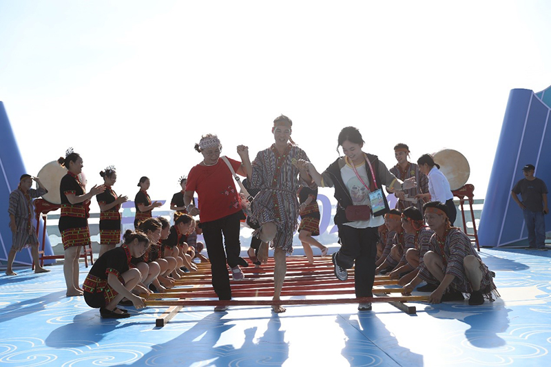 游客體驗竹竿舞。人民網(wǎng)記者 孟凡盛攝