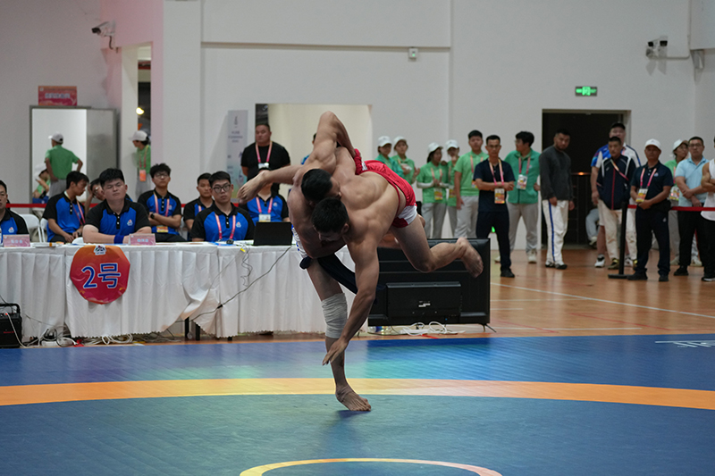 廣東隊選手呼日與內(nèi)蒙古隊選手朝克圖巴特爾在希日木87公斤級決賽中角逐。馬那甫攝
