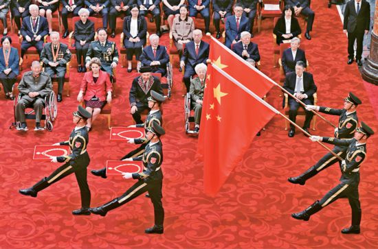 新中國成立75年來,中國共產(chǎn)黨團結(jié)帶領(lǐng)全國各族人民,創(chuàng)造了經(jīng)濟快速發(fā)展和社會長期穩(wěn)定兩大奇跡,中華民族偉大復(fù)興進入了不可逆轉(zhuǎn)的歷史進程,全黨全國各族人民“四個自信”明顯增強、精神面貌更加奮發(fā)昂揚。2024年9月29日,中華人民共和國國家勛章和國家榮譽稱號頒授儀式在北京人民大會堂金色大廳隆重舉行。圖為禮兵護送國家勛章和國家榮譽稱號獎?wù)氯雸觥?新華社記者 岳月偉/攝